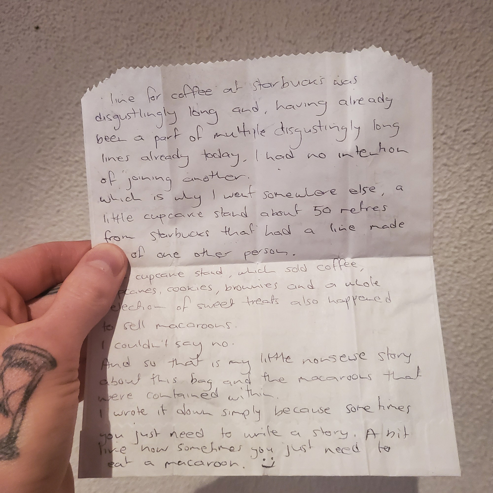 Oh, I didn’t really want to write this story in the Paperblanks journal I had been using on my trip, so I wrote it on the very bag in which the macaroons came. That’s it in the pictures below.